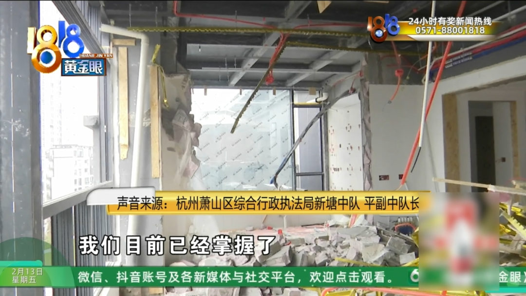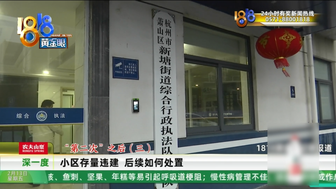 杭州萧山区综合行政执法局新塘中队 平副中队长:目前存量的违建的排摸,我们目前已经掌握了物业的信息和我们日常排摸的数据。这些数据我们会报给新塘街道,然后我们会按照街道的统一部署,针对于存量的违建,街道后面会统一统筹,制定集中的拆除方案,来妥善处置的。对于新增的这些件,像比如说这次涉及到的这一户业主和其它新增的这些违建,我们都是即查即拆的,我们城管局负责查,街道负责拆。