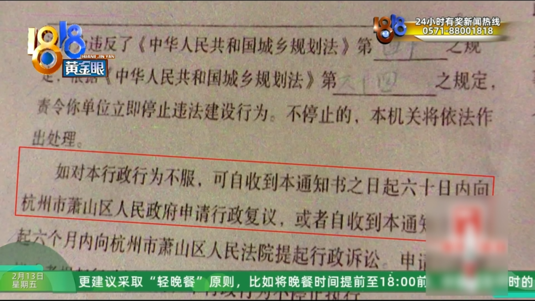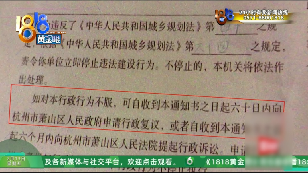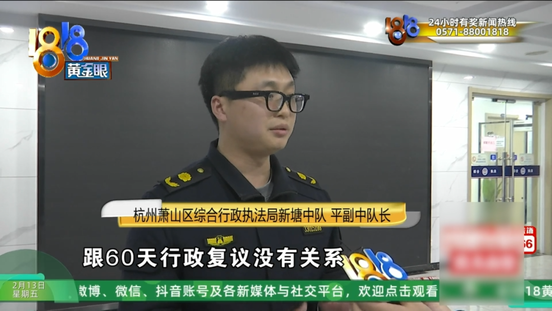 杭州萧山区综合行政执法局新塘中队 平副中队长:跟60天行政复议没有关系,因为是这样的,今天是萧山区新塘建道办事处,他们是一个拆违控违的主体,我们综合行政执法局的话,其实是主要做执法工作的。那我们目前来讲做的所有的动作,只是开具了《责令停止违法建设行为通知书》,并且把情况上报给街道。今天是新塘建道办事处的城建办牵头,对他们这一户的违建情况进行一个拆除。