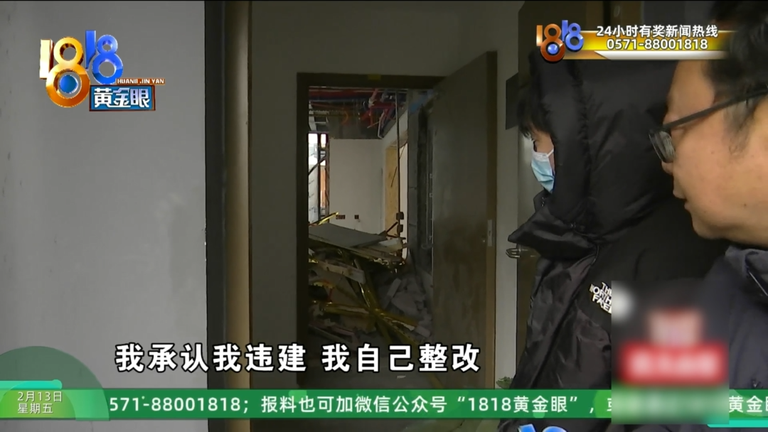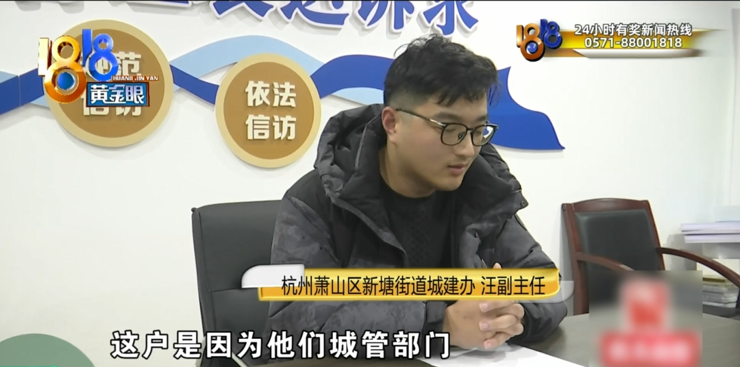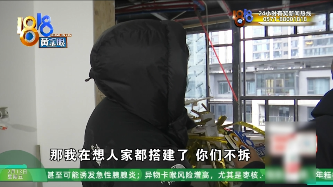 杭州萧山区新塘街道城建办 汪副主任:一楼的那一户,我也是这个情况不是很了解。因为这个违法搭建是城管部门他们认定的,我可能听说他们今天上午也给你们看了,他们昨天开具的那个责令整改通知书。因为上午我也没看到,他们没给我看。具体的也等他们城管部门,他们认定是违法事实以后,是否组织我们城建部门力量去现场进行一个拆违。其它的你说选择性执法,因为我们城建这边接收到的可能也就这么一起。